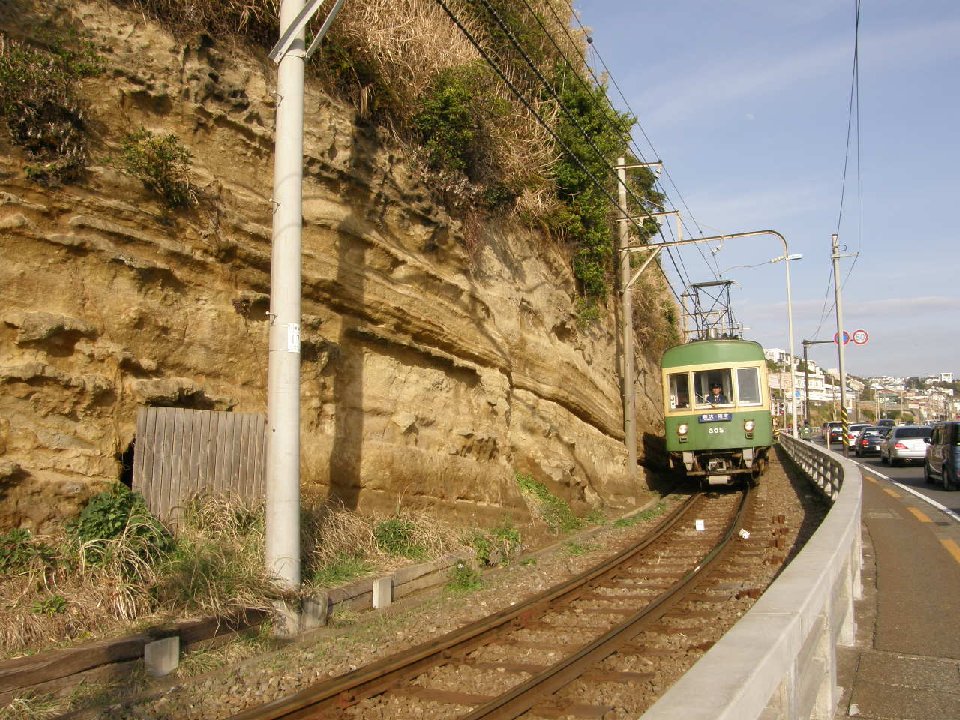 車窓からは、近過ぎて見えないかも知れないですが、脇の国道を散策していると、軟らかい部分が削られて溝(窪み)になっているのが、割とハッキリ見えると思います。 ただ、一つだけ難点が…写真でもお分かりの通り、歩道が狭いので、人や自転車の邪魔になってしまいかねない事だけは、ご注意下さいませませ。 江ノ電の注目ポイントが、また一つ増えた気がします。