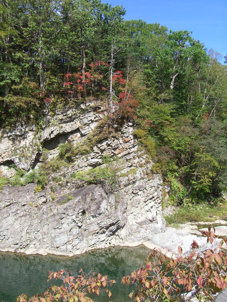 北海道芦別市にある三段滝で見られる地層です。 水際にたたずみ、紅葉でほんのり色づく様はたいそう趣深く…。 地層の傾きっぷりも素敵ですが、ここは遊歩道もかなり傾いていました。行かれる際は足元にご注意を! 写真は2008年9月に撮ったものです。