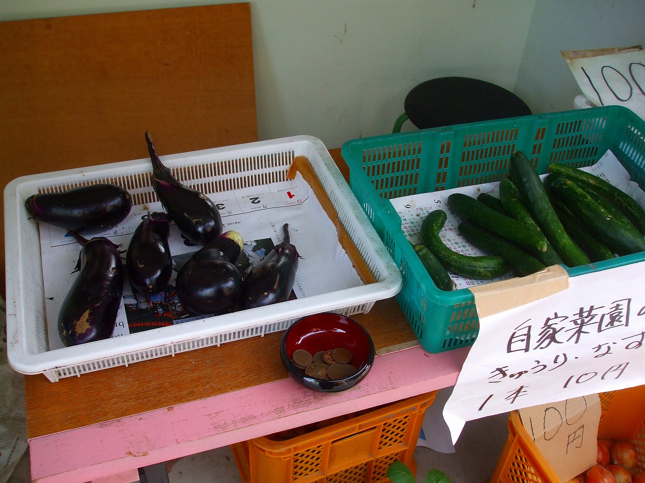不揃いだったりしますけど季節の野菜や果物が1袋か1個で100円です(たまに200円くらいも)