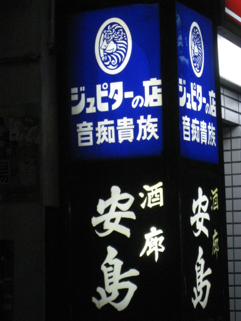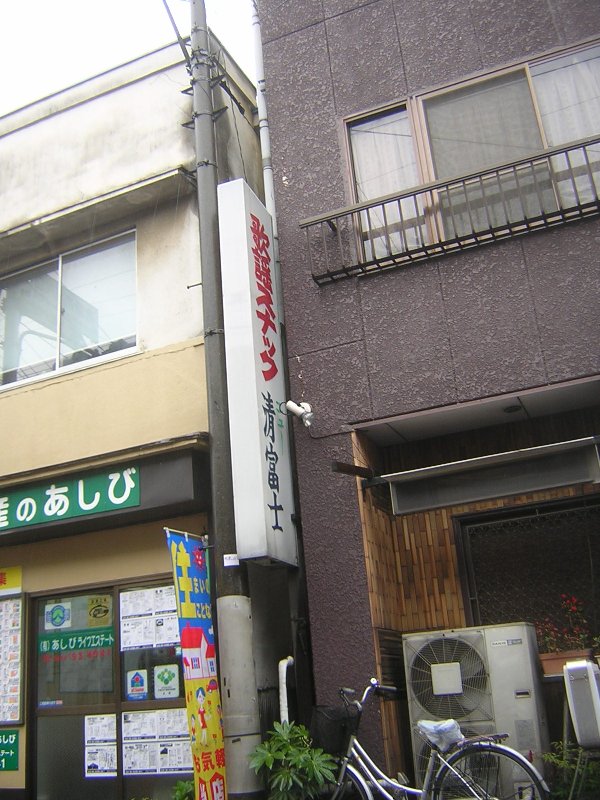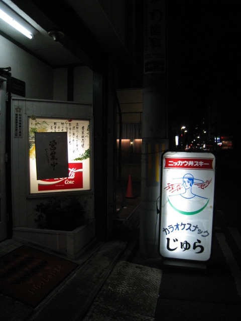 場所は「記憶に間違いが無ければ」と云う条件付になってしまいますが… ここでは、客が歌うのか、ギター弾きの人とかが「生ジュークボックス」として唄ってくれるのか、それが不明ですが、何れにしても、こう云う形態の店って、極端に数を減らしましたよねぇ… 因みに写真ですが、数年前、信号待ちの車の中から、半ば条件反射的に撮影したものなので、看板が見辛い角度になってしまいました。