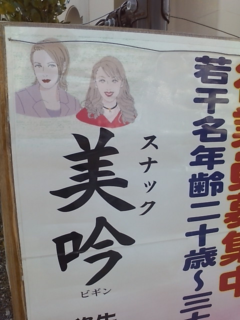 お店の看板じゃなくて残念ですが。 スナック「美吟(ビギン)」です。 若干名募集中だそうです。 やっぱり恋しくてでしょうか。