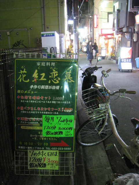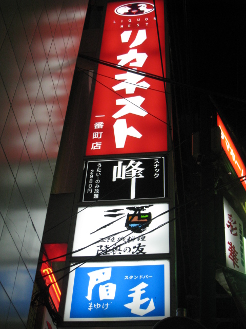 JR北仙台駅前で見つけました。ここのママは「ママ」じゃなくて「ハハ」と呼ばれていることでしょう。この商店街(飲み屋街)は観音様のお膝下とはいえ、「念波観音力(ねんぴーかんのんりき)デー」というのも気になります。「念波観音力」に「デー」付けるか。 あと、「あなたと私のいこいの園」も気になります。