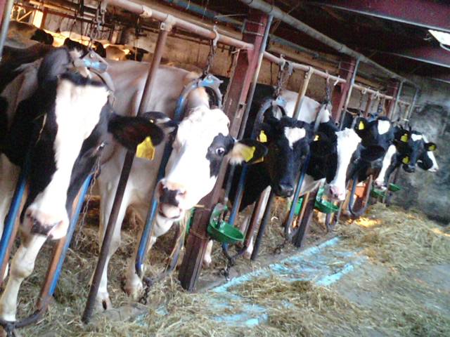 今どき珍しいレトロなスタンチョン(一頭ずつ固定)方式牛舎です。 ちなみに実家の牛です。 私を見てえらい驚いてました。