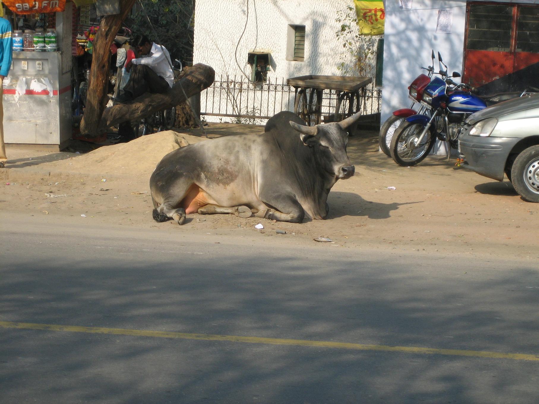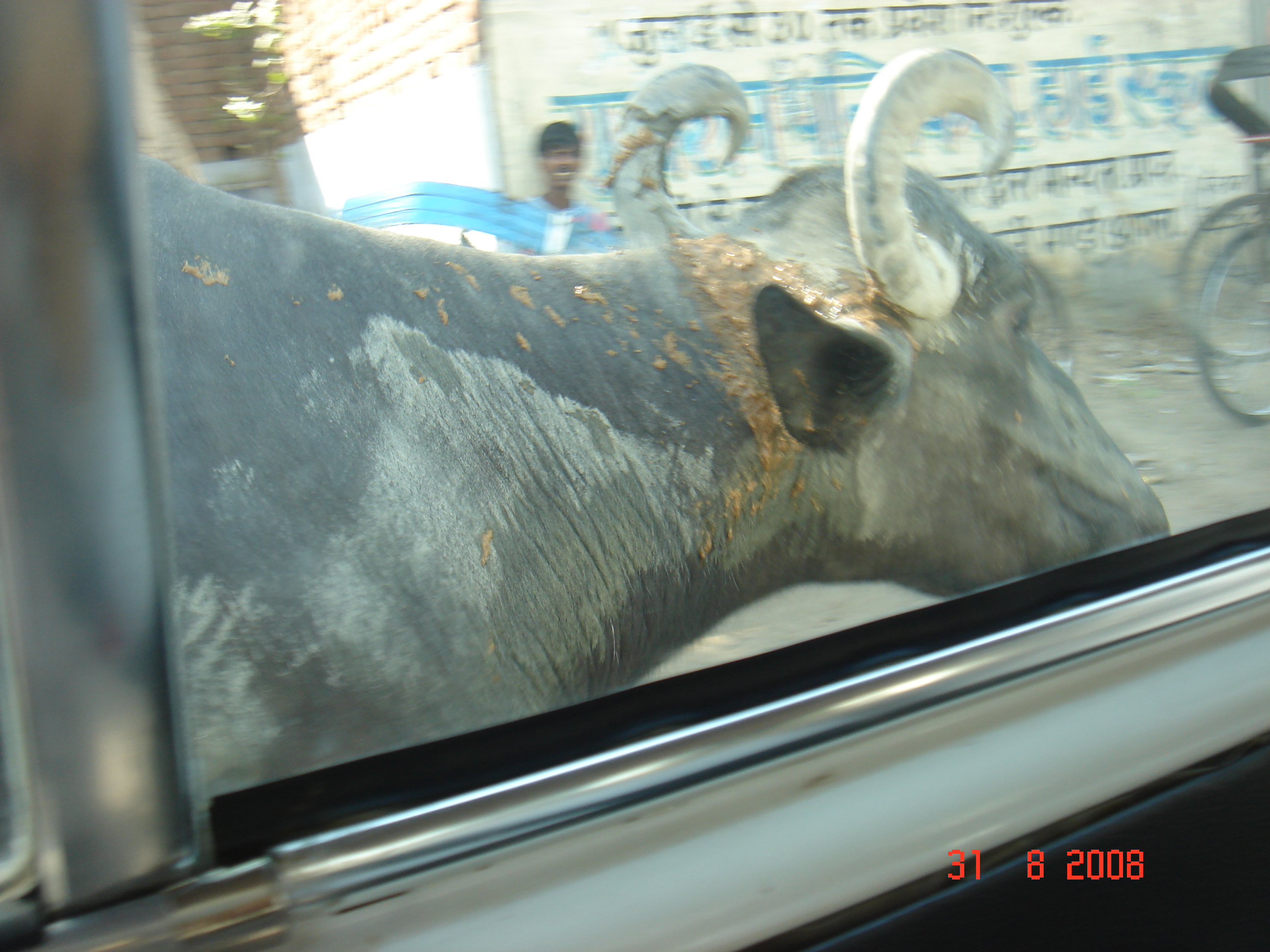 野良インド牛です。 「フツーにいる」 とは聞き及んでおりましたが、 バイクのすり抜け状態のような 激近のポジショニングでしたので 慌てました、コチラが! (クルマの中から『焦り撮り』です。) 国産牛じゃなくてスミマセンー。
