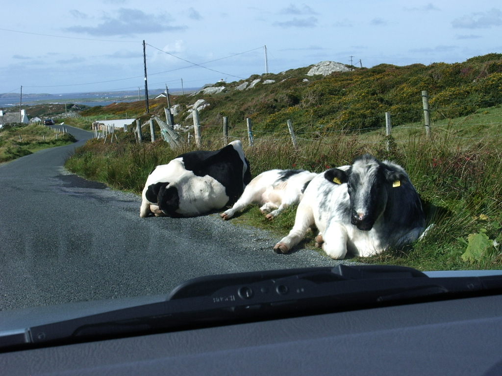 アイルランド西部のコネマラ地方にて撮影。 この辺りでは、牛も羊もアナーキーに道路に出てきます。こっちが威嚇されそうです。 よく見ると子牛をちゃんと真ん中にはさんでガードしているあたり、さすがだと思いました。でも危ないよ。