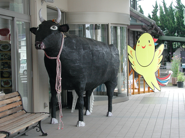 道の駅・神鍋高原にいた牛です。 はばタンが今にも飛び乗らんとしていました。