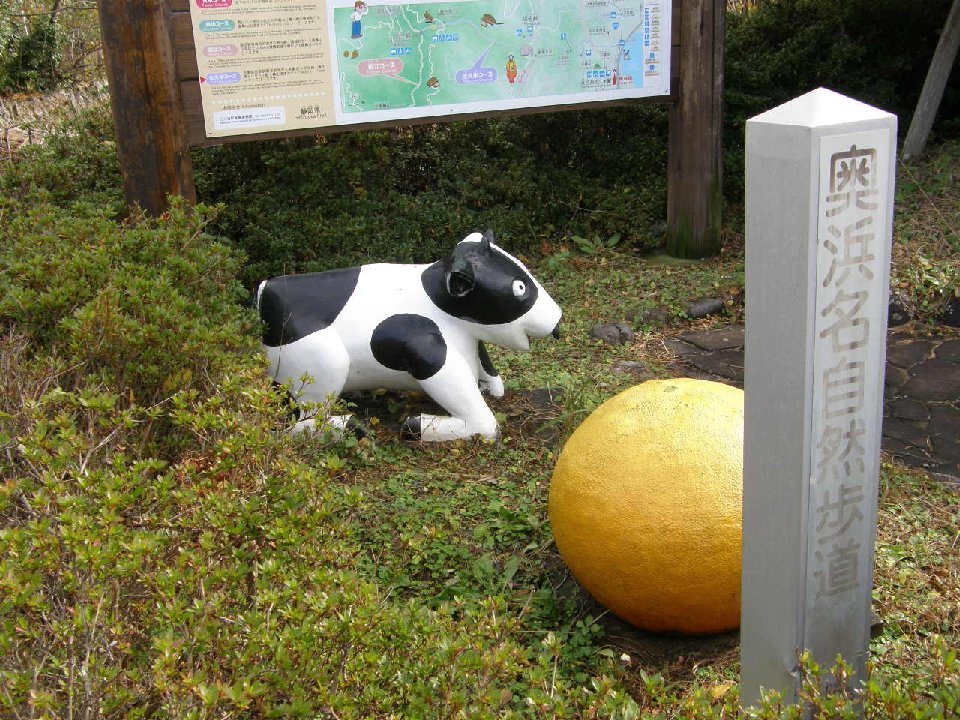 連投になりますが… この像、当地名産の「三ケ日牛」をモチーフにしたものらしいです。 駅前、散策道の基点の案内看板の袂に置かれています。隣の蜜柑は、三ケ日蜜柑。農業・畜産の地元代表格を並べてのアピールと云う事なのでしょう。 写真では分かり辛いですが、現物は、かなり呆けた表情をしておりました。呆け具合が一番強く出ているのがこのアングルなのですが、写真ではそう見えてこない辺り、残念と云えば残念です。