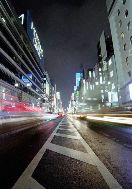 少し古い写真で申し訳ないのですが、2002年12月の銀座です。たしか「安いカメラで銀座の夜景を取ろう大会」を開催していて、そのときのひとコマだったと記憶しています。 自動車がビュンビュン行き交う中央通りは、けっこうヒヤヒヤモノでした(道路中央の安全地帯にカメラを立てて撮影しています)。