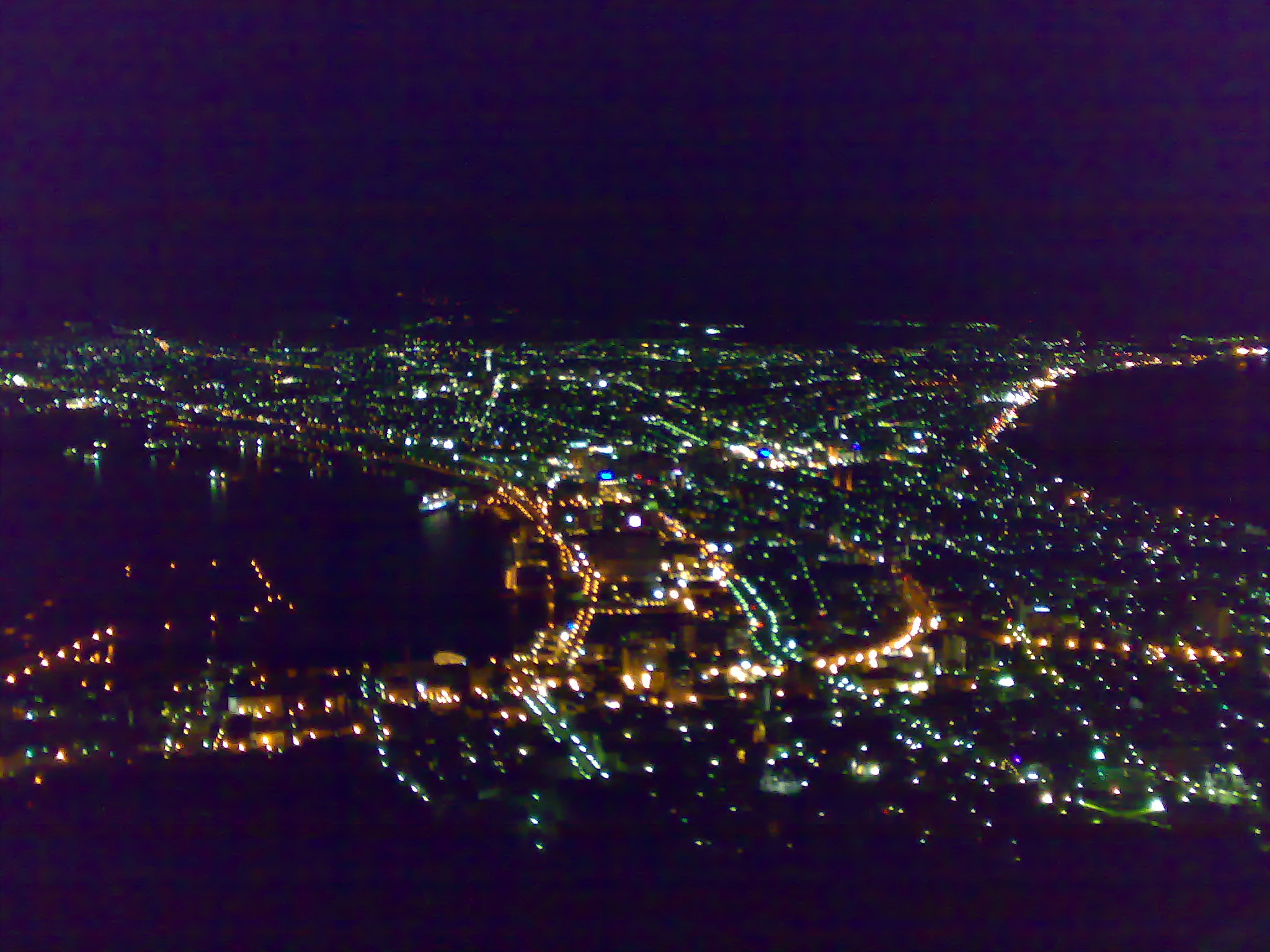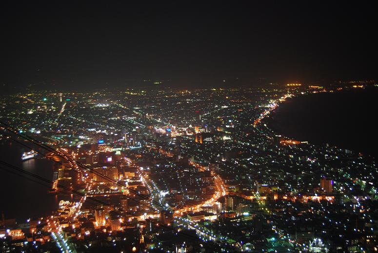 2009年5月に函館山から撮影した夜景です。左端に写っている線はロープウェイのロープです。日没後からだんだん暗くなって行く様子を5分間隔で撮影していましたが、一番最後に撮影した写真です。軽装で登ったら一気に冷え込んで来たので、撮影後は大急ぎで下山しましたが、美しい夜景に感激しました。