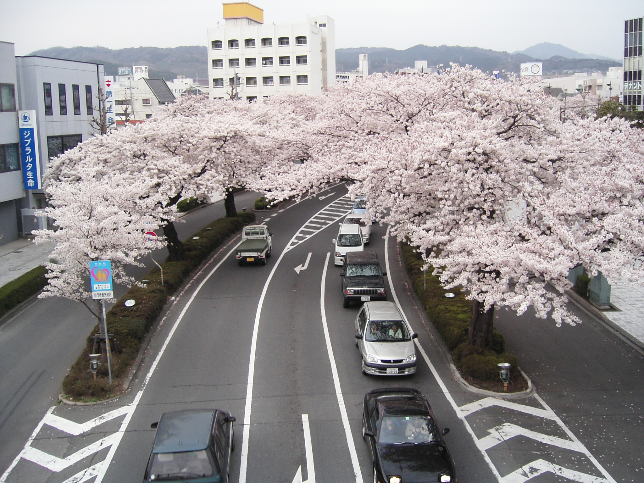 日立市は、太平洋戦争の空襲で大被害を受け、この道は戦後の復興で建設されたものです。その道は「平和通り」と命名され、車道の分離帯にソメイヨシノが植えられました。春は、車道が桜のトンネルになり、ドライブすると大変美しい景色が見られます。