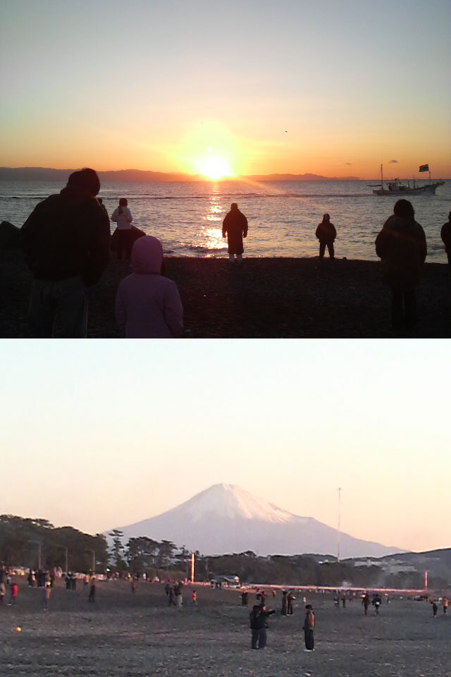 地元の家族連れや、小中学生たちで賑わっていました。 船も出ていました。 日の出時刻は、7時になる数分前だったと思います。 同じ時刻に同じ海岸から見えた富士山の画像もオマケに付けておきます。