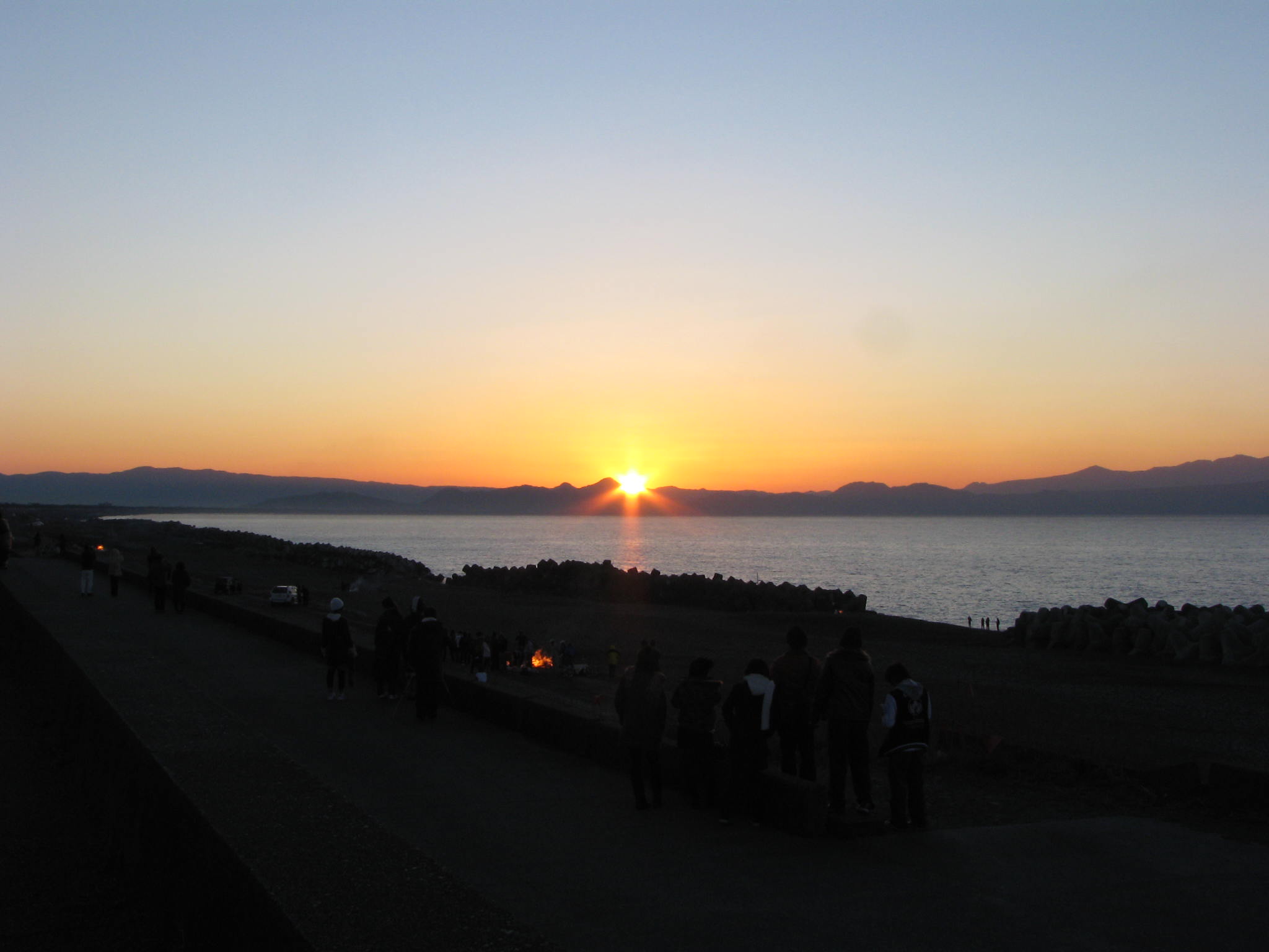毎年大勢の友人と年越しキャンプをするのですが、そのときに撮った初日の出です。相模川上流・相模原市田名の河川敷。だいたい6:55くらいから出始めて、この写真を撮影した時刻は7:02でした。 日の出前はモーレツに寒いのですが、結構たくさんの人が見に来ていました。