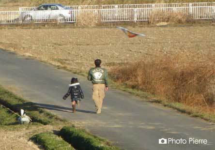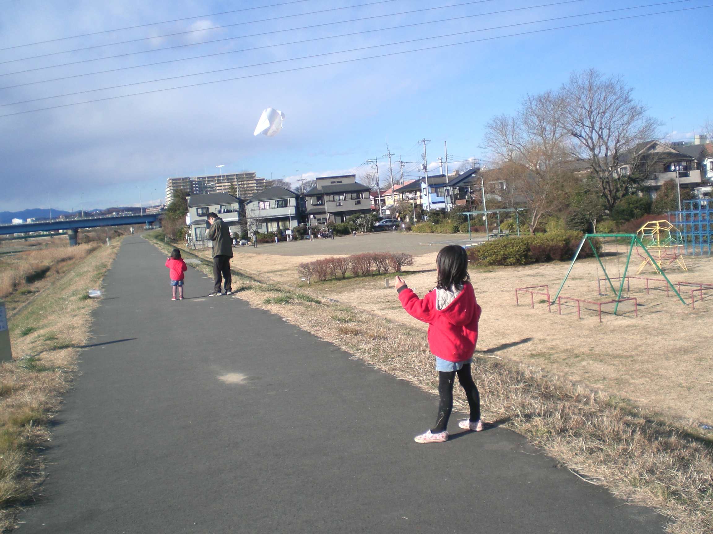 凧あげ帰り風の親子を見かけました。 すっかり夕方でしたので。 でも、楽しそうでした。