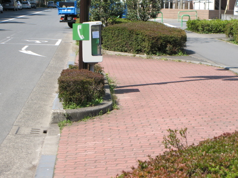 かなり以前からあった記憶があるのですが、まだありました。幅が広い歩道の一部が車道側から通り抜け出来るようになっていて公衆電話が設置されています。 車道側の手前には「車いすマーク」が描かれてあり、ここの進入路に「→」が付いている点から、単なるドライブスルーというよりもバリアフリー対応のようです。電話機の設置位置も結構低く、車からだけでなく、直接車いすでも使い易い高さかも知れません。