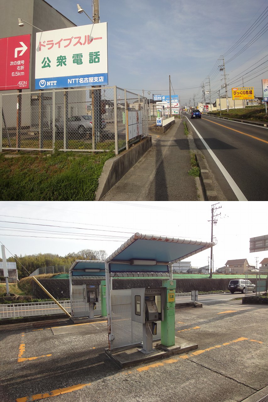 ISDN型が二台並んでいる、日進ビル前のドライブスルー公衆電話です。 試しに受話器を上げてみると、「カードを入れてください」の様なメッセージが出ましたので、今でも使おうと思えば使えるのかも知れません。 但し、隣に並んでいるカードの販売機が生きているのかどうかは未確認です…