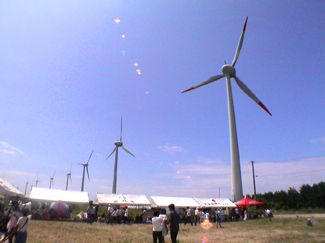 デイリー道場でも紹介していただいたことのある、能代宇宙イベントですが、ロケットを打ち上げる会場は風力発電の隣にあります。 写真がちょっときたなくて恐縮ですが、これは2005年の第一回イベントの時のもの。今年も8月に開催予定です。