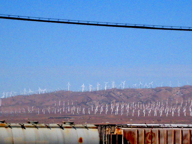 これもデイリー道場で紹介していただいたことのある、アメリカ民間宇宙開発の聖地、モハベ空港近くの風力発電です。 ゴミみたいに見えますが、一本一本が全部風力発電です。 もっと引いた写真もあるのですが、一つ一つがこれ以上小さくなると識別不能なので。