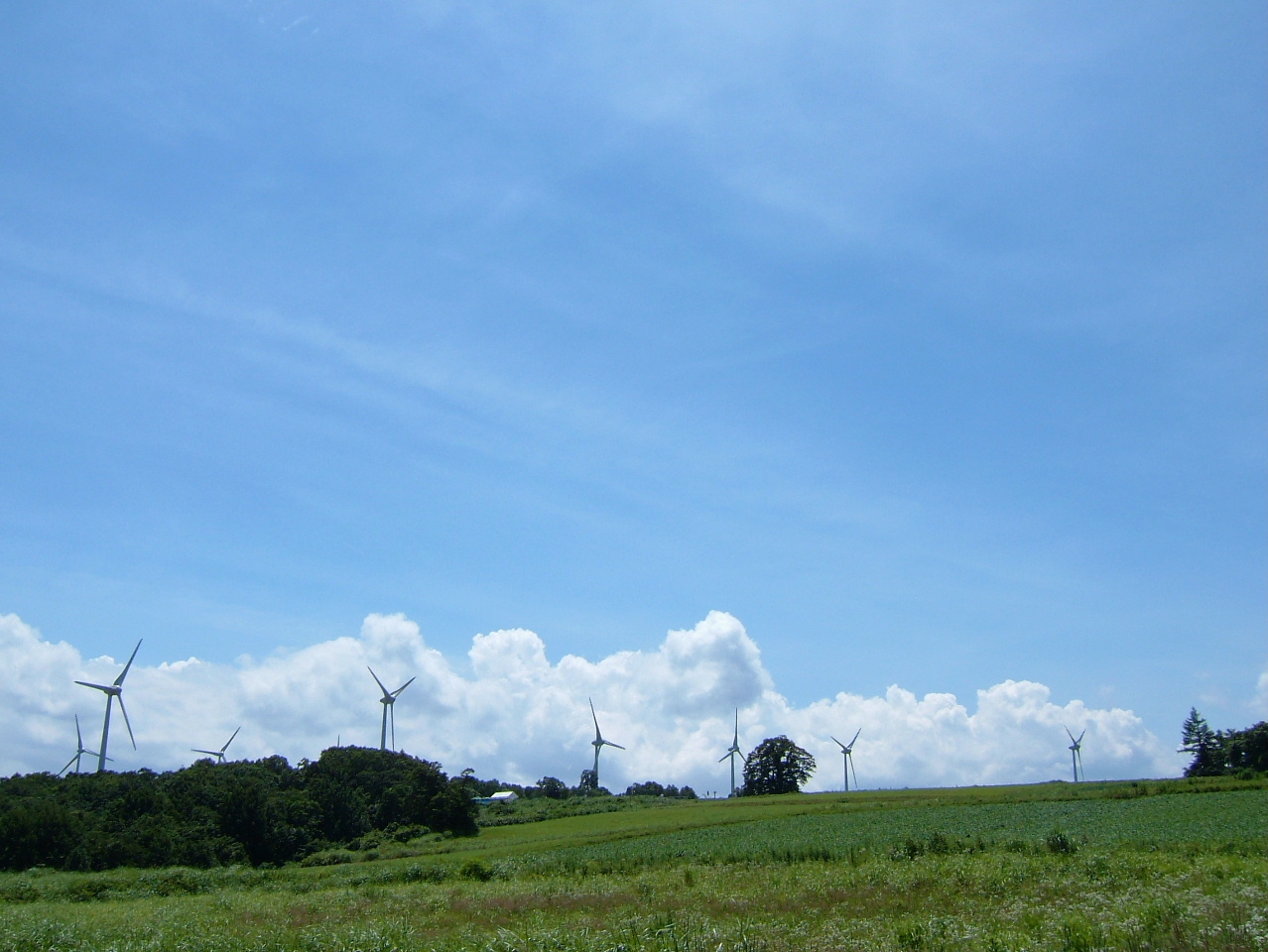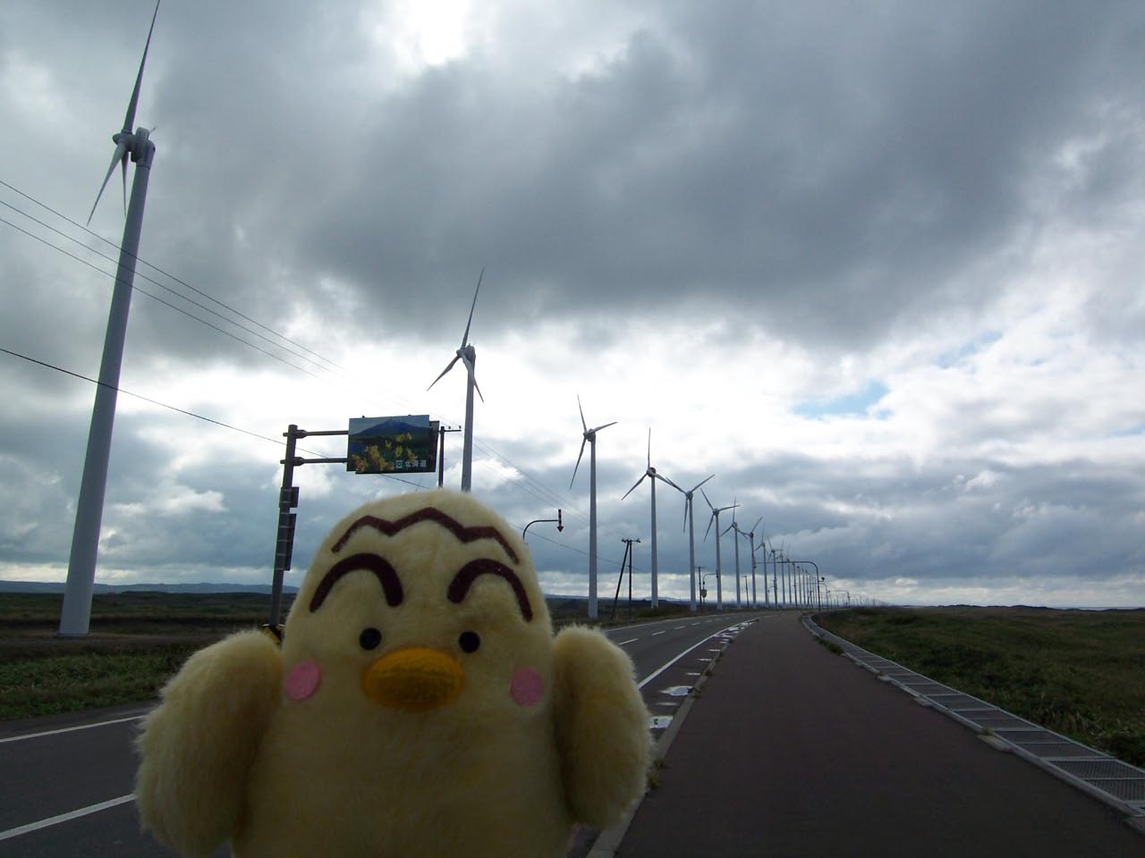 ここ二〜三年のうちに、20基近い風車が生えました。 山に見えているのが実はクジラで、そのうち風車をタケコプターにして飛んでいっちゃうんじゃないかと期待しています。