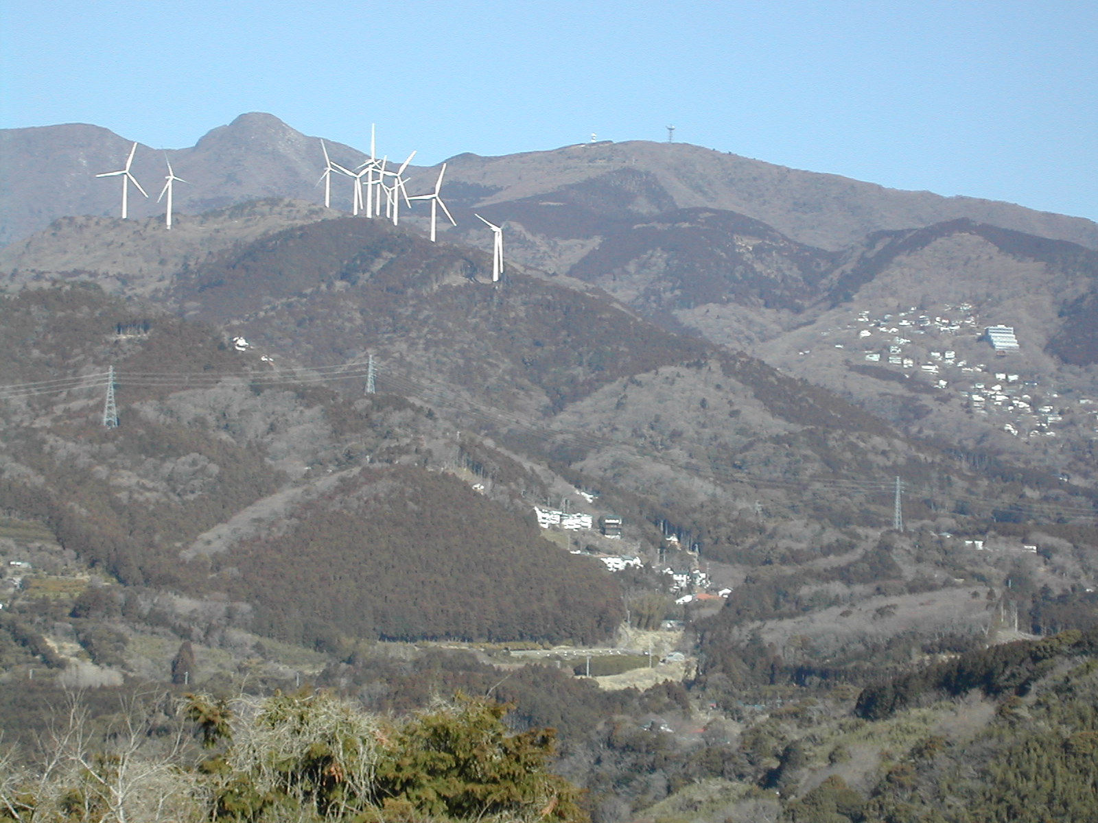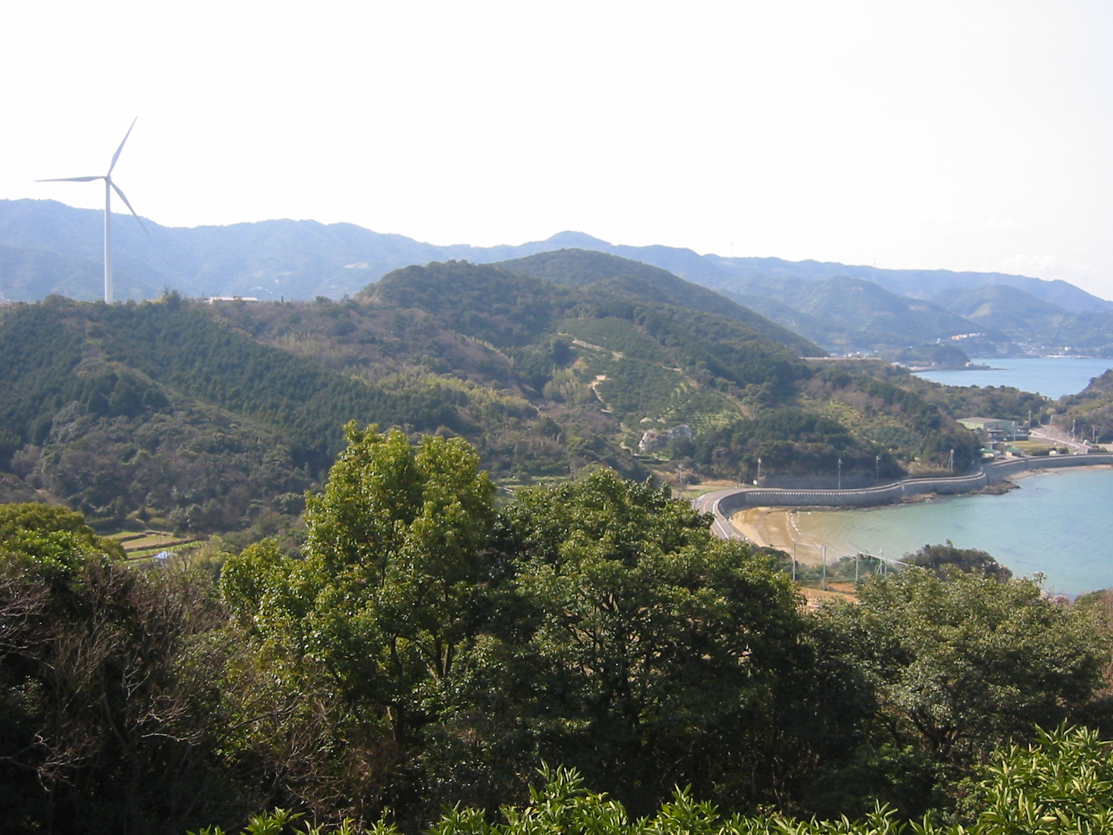 伊豆にウォーキングに行った時に撮ったものです。 伊豆バイオパーク付近に目立つプロペラが3機並んでますが それがある山から伊豆熱川側を振り返った風景です。