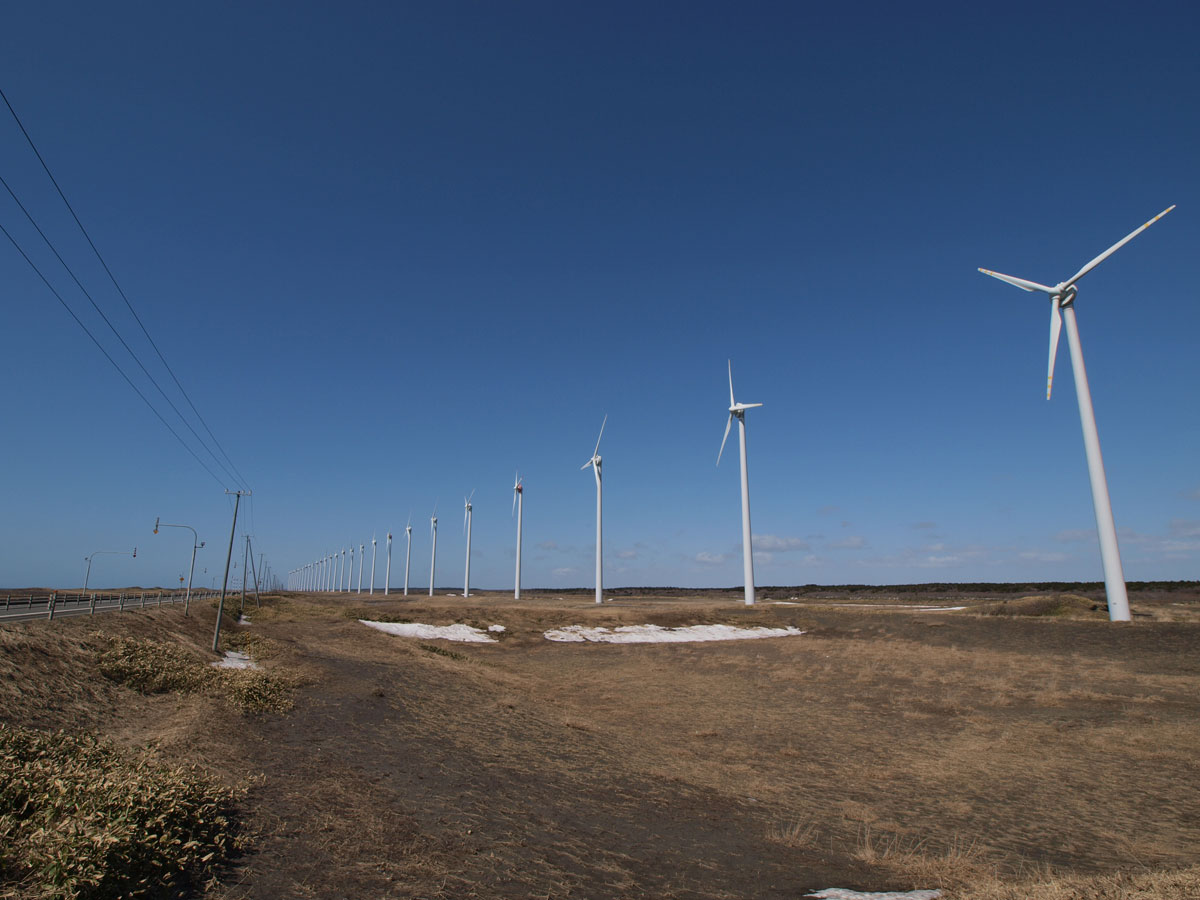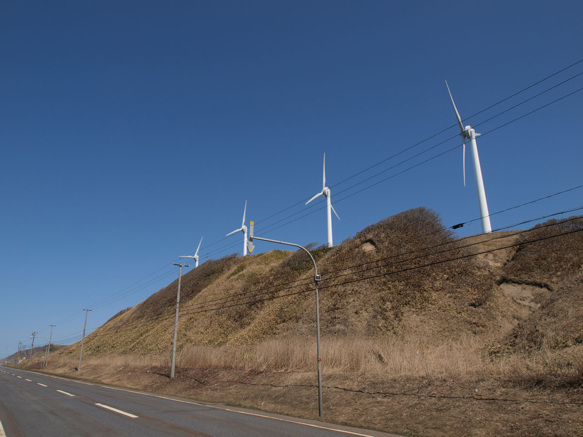 留萌から稚内方面に日本海沿いを進む国道232号は風車が次から次に出てきます。 写真は小平の道の駅手前の風車4棟です。