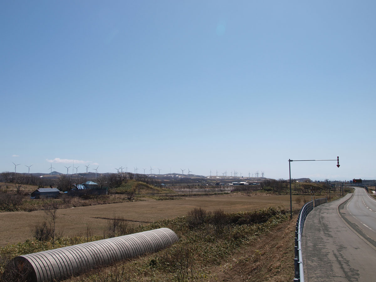 天塩町から日本海沿いを進む道道を進んで、天塩川にかかる橋を渡るとこれが見えてきます。 計28基の風車が一直線にならぶ光景は壮観ですね。