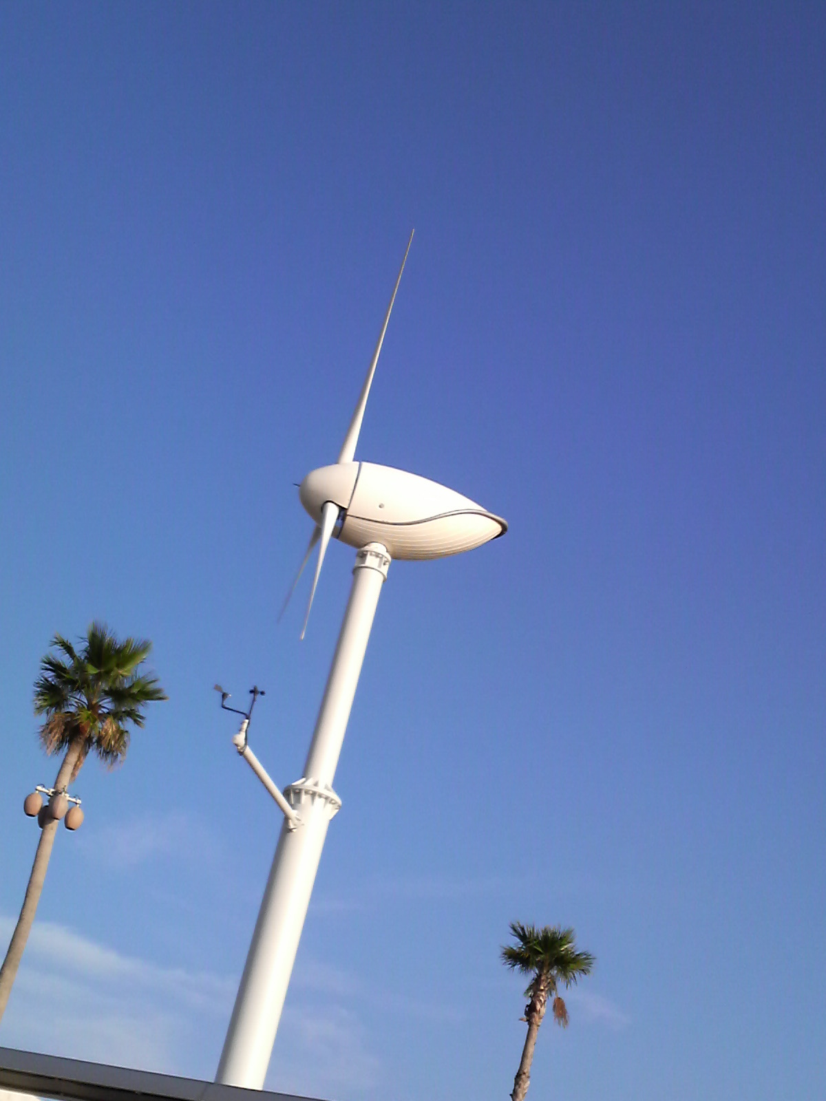 かわいい『空飛ぶくじら』の風力発電です!! ポートアイランド(神戸市、人口島)西側にある「ポーアイしおさい公園」園内に設置されています。 因みに、一緒に写っているヤシの木についているヤシの実は、電燈です。偽物です。