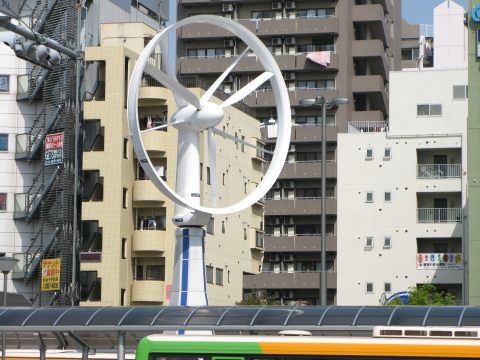 「風車」というと、どちらかと言うと海辺とか周囲に何もない風が吹きさらす・・・というイメージが強いのですが、この風車は何と都内の駅前広場にあります。地下鉄・葛西駅前広場が整備されて地下に日本最大規模(9400台)の駐輪場が完成したのを記念して昨年設置されたもの。毎時10Kwの発電力を持つとのこと。全自動駐輪場に必要な電力の一部をこれで賄うとのことながら、この発電量では全体の1%未満しか供給はできないらしい。(東京都江戸川区)