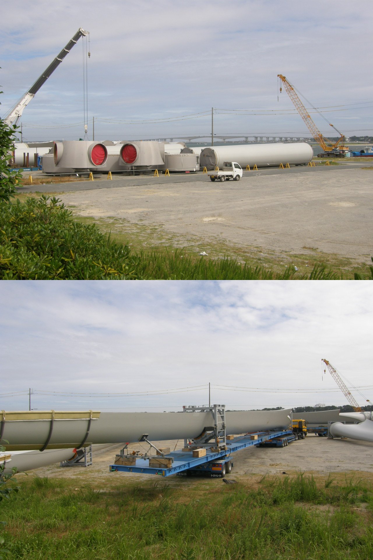 …こう云う形でも良いでしょうか? 発電風車が、部品の状態でバラバラに置かれている光景…何とまぁ、余りの大きさに驚かされます事…殊に、トレーラーに乗せられた羽の長さなんかは… 周辺の道路には、8月上旬まで何度か、これらを深夜に道路で運搬するので注意をお願いする看板が数多立てられていますが、道路の建築限界を超えている部品ばっかり…実際、どうやって運ぶのやら…新幹線車輛の街中運搬なんて目じゃ無い壮観さでしょう、きっと。