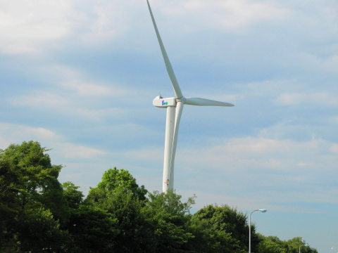 茨城県日立市は日立製作所の企業城下町ということもあり、発電所建設関係の工場が多いです。 画像の風車も風力発電関係の工場の中に建てられています。 工場の電力を発電するものというよりは、社員の教育用・実験施設としての色合いが濃いようですが。 風力発電の風車というと、人里離れたところにあるものですが、住宅地の中にそびえる風車というのは珍しいんじゃないかなと。