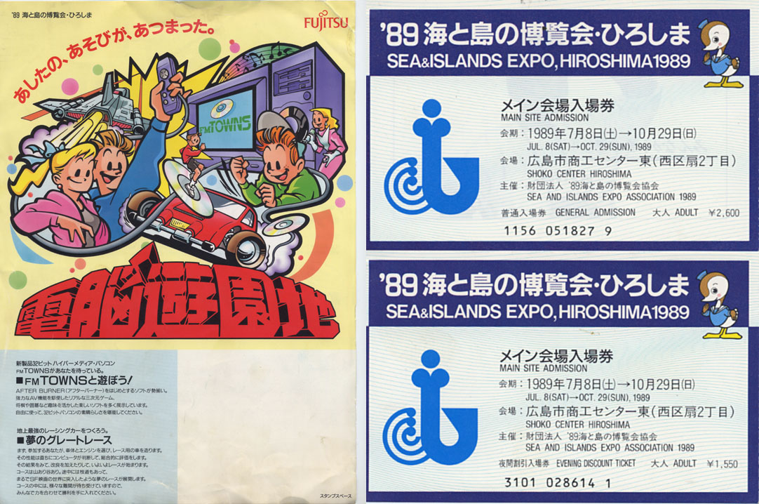当時の入場券とパビリオンのチラシです。 富士通さんは「ワンダーエレクトロニクス館」(共同出展館)に参加されていた模様。 「新製品32ビットハイパーメディア・パソコン」というコピーが泣かせますね(笑) そういえば「DPZエキスポ」も「博覧会」ですよね。 参加された方、レポートお待ちしてます(ヨイショっと!)