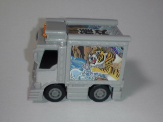 依頼主です。自分で依頼し、真っ先に投稿してすみません…。 近所のコンビニでコーヒーの「BOSS」を買ったら、景品のチョロQになってついてきました。 どうやら全9車種あるらしい。これは「雅丸」というらしく、虎の絵が書いてありました。 タイムリー!と思って投稿してみました。 それにしても、なかなか、本物のデコトラにはお目にかかれないですねぇ…。