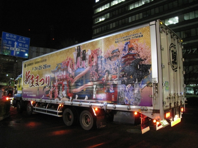 ツアートラックっぽい見た目ですが、夏のお祭りなのに見かけたの冬だし。。。ということで、こちらに投稿いたします。 けっこうデカいトラックに絢爛豪華な絵が描かれていて、迫力がありました。件のお祭りにも興味がわきます。