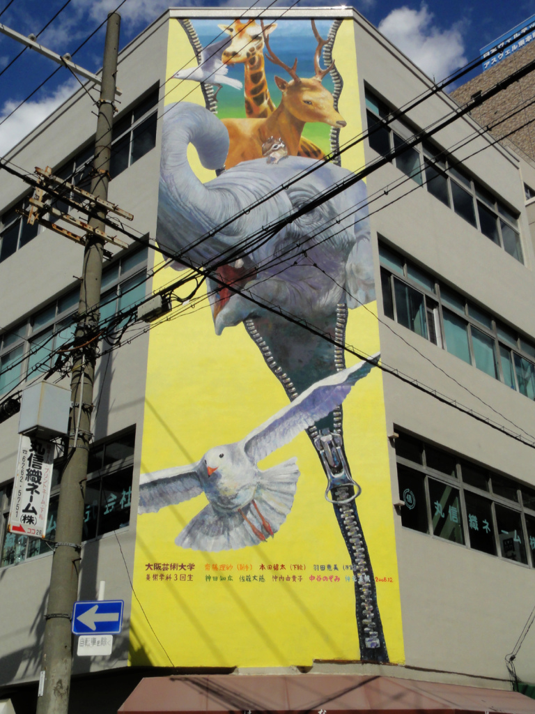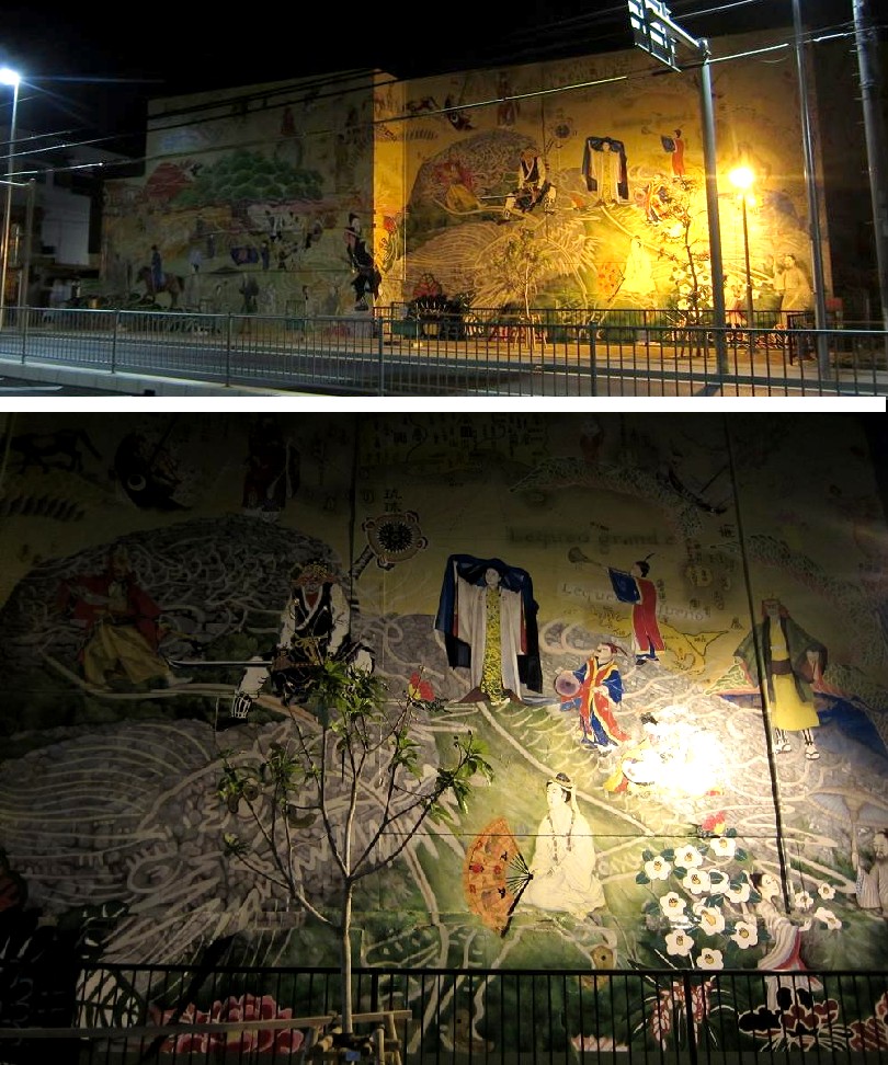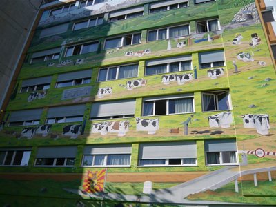 しかも・・・それぞれの絵に関連は無く、南面は北欧のバイキング肖像、西面は・・なんか建物そのものを欧風アンティーク宝箱に見立てたペイントに全くテイストの合わない写実的なスポーツ施設の説明イラストを重ねてます。つまり3種類。・・