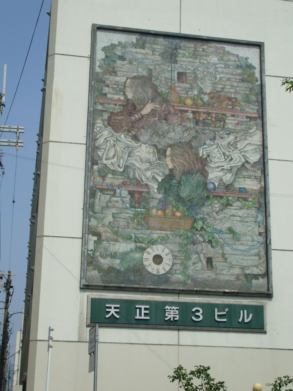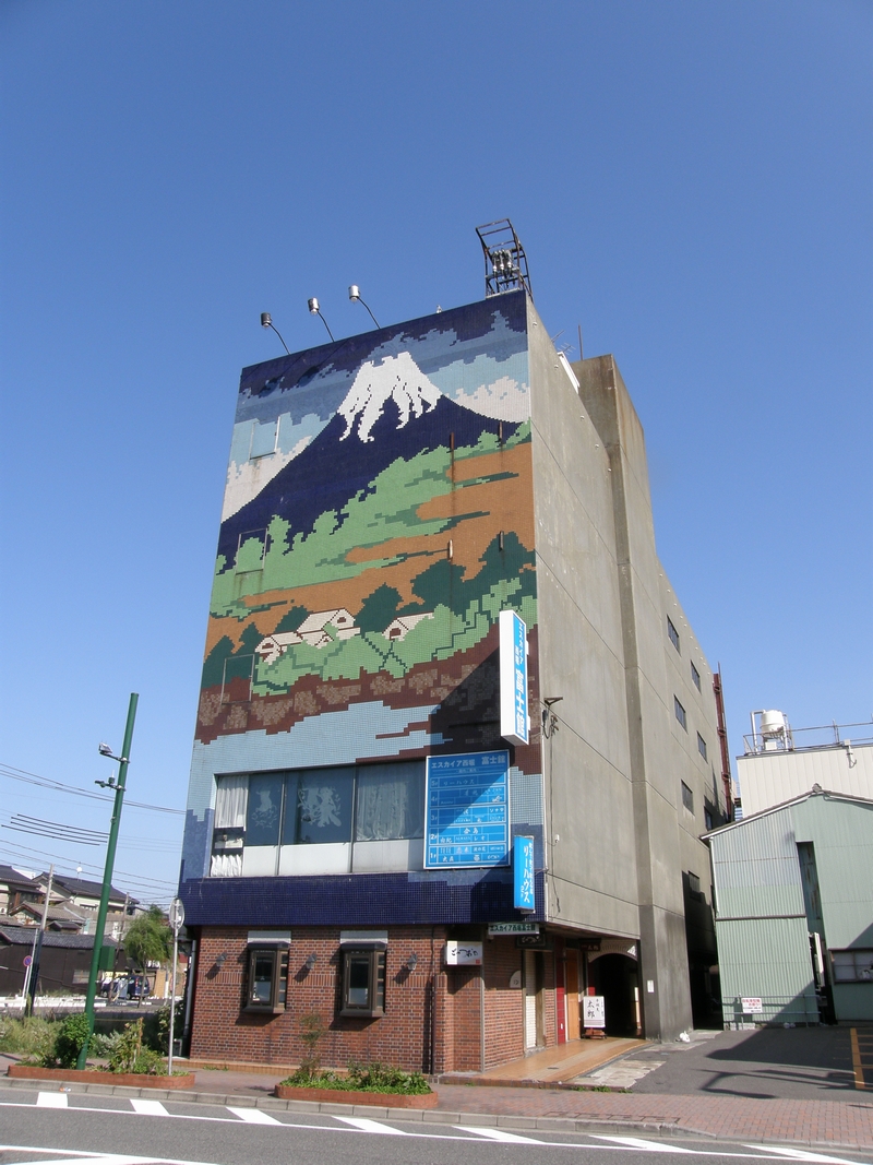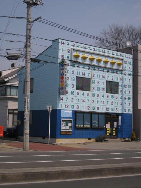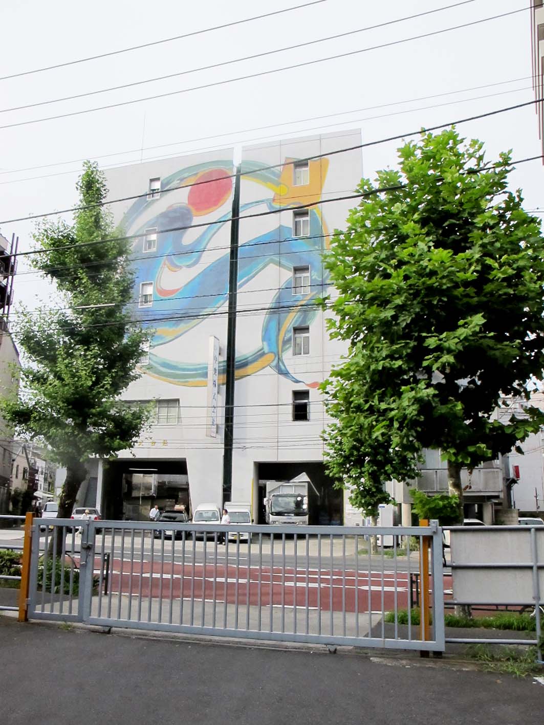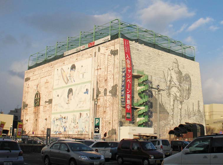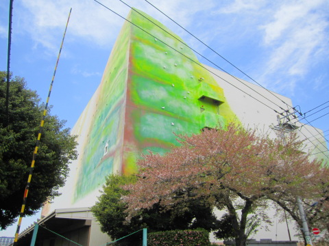 ・いやもしかしたら裏面にも絵があるかもしれません。窓の無い建物は絵を描きたくなるのでしょうが、スポーツ施設らしくは無い絵ですよね・・・周囲は広い平面駐車場で撮影しやすかったです。