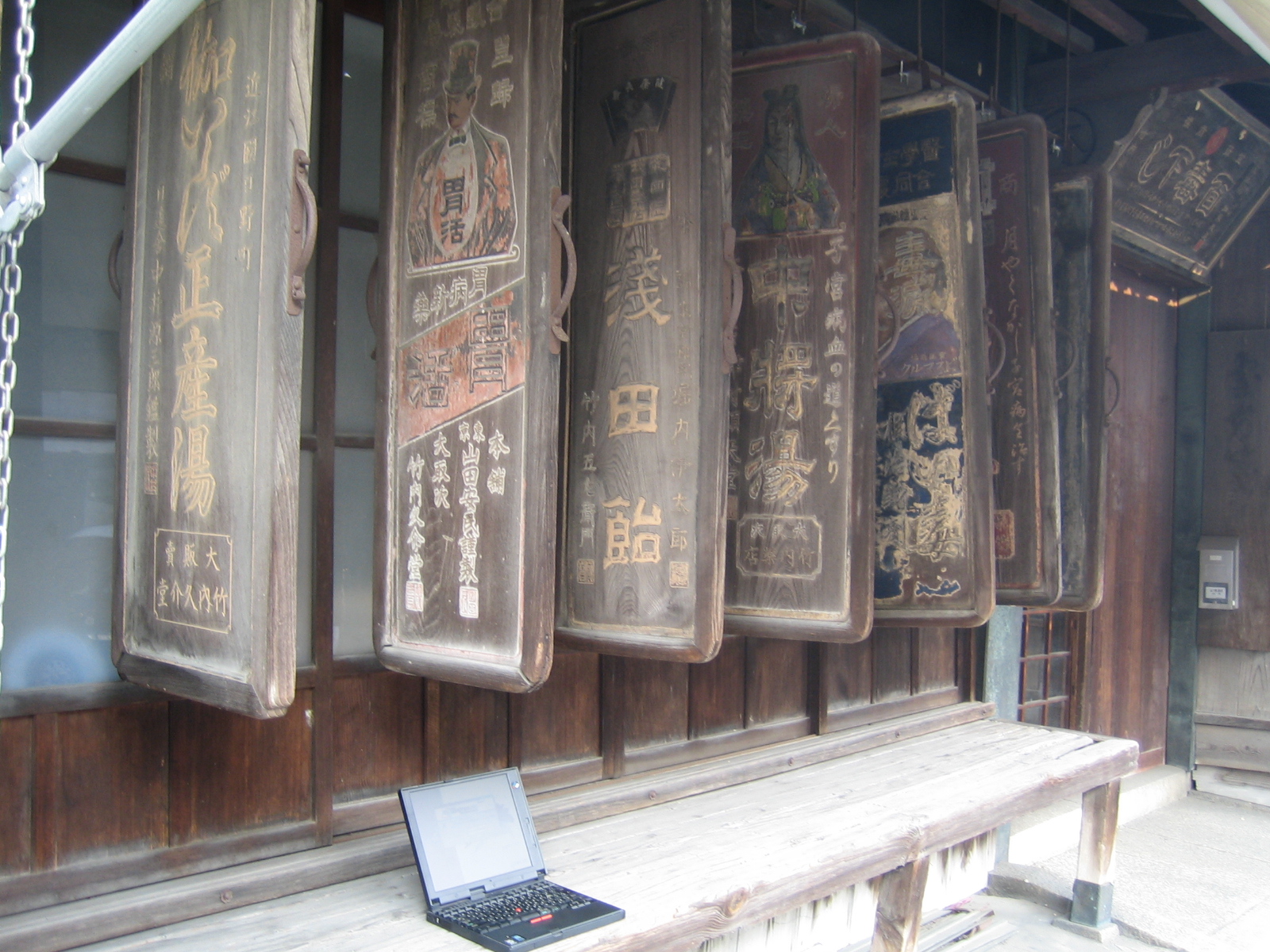 お店とかではなく、お寺です。 うっすらとですが、 『海嶽寺』とあるのがわかるでしょうか。 現在は新しい看板がかけられていて、 (こうゆうの、看板て言うのかな?(^^;) これは、本堂の端のほうに飾られています。 このお寺、老朽化により建て替え工事真っ最中。 新しくなったら、この看板、どうなるんだろうな〜。