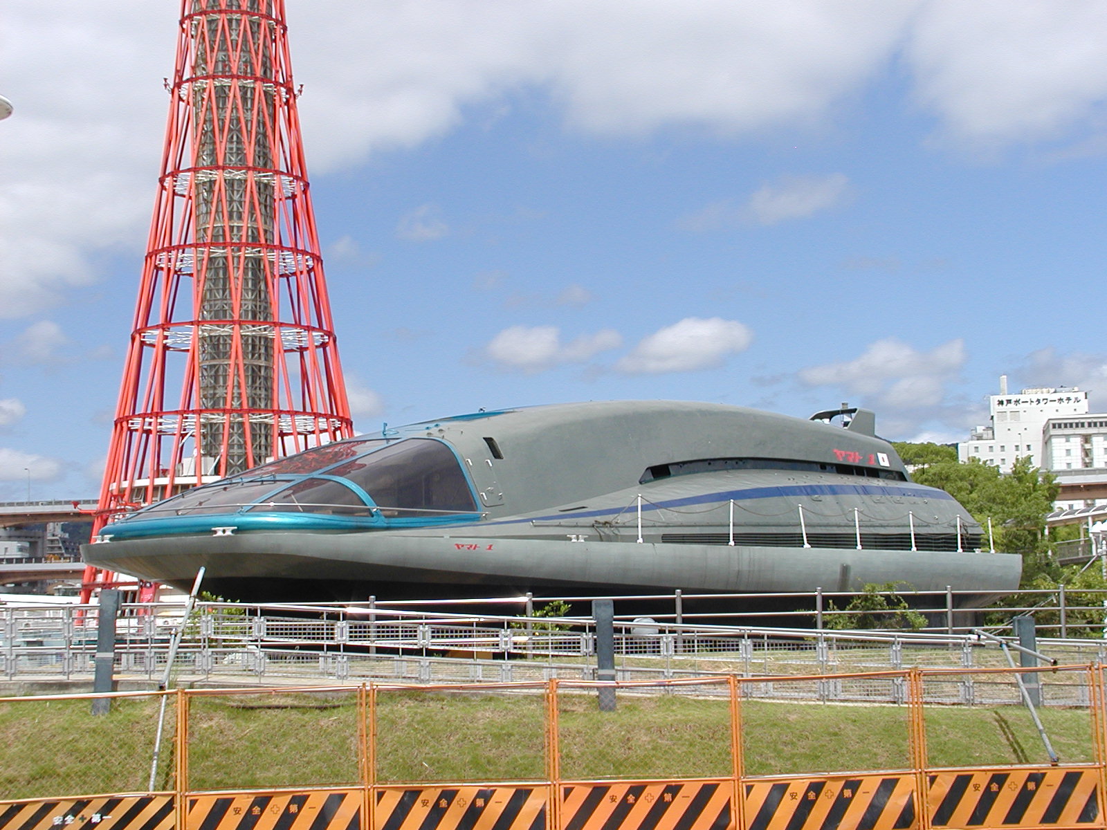 神戸港に展示されている電磁推進実験船「ヤマト1」です。推進方式も近未来ですが、デザインも近未来です。