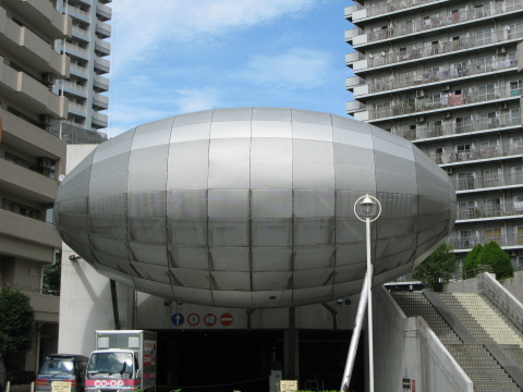 都心部の高層マンション群にある駐車場入口上のオブジェ? 単なる飾りなのか、中身に何か用途があるのか不明な「未知な物体」
