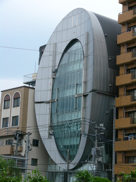 美容専門学校です。 現代建築の一流ブランド,高松伸氏の設計です。 個人的には近未来的というよりは,前衛的という べきか,と思っております。 この形は学校の頭文字の「O(オー)」の字を表 しているそうです。 ちなみに夜に観ると綺麗です。