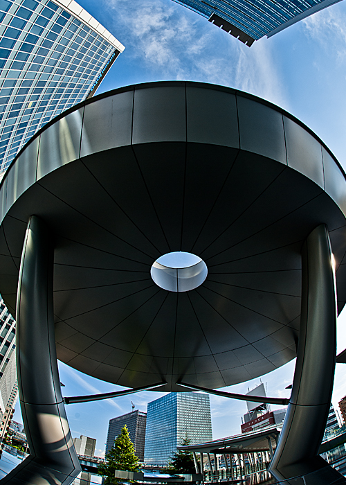 大崎駅の近くには近未来的なものがあります。自分が見つけたのはこの円盤、下には磨き石、水が流れています、オフィスビルの入り口にあるのでとても目立ちます。これは下から撮ったもの蛙のように見えました。自分は昼間に撮りに行きましたが、ここら辺は高層ビルも多く夜景を撮るのにもいいようです。