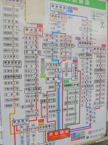 渋谷駅(東口)の都営バス路線図。 同駅周辺(東側のみ)から発着する8系統10方面の都営バス路線を掲載。とりあえず各路線の全停留所を目一杯詰め込んだ感いっぱいで、方角や停留所間の位置関係は全くお構いなしにびっしりと描かれています。