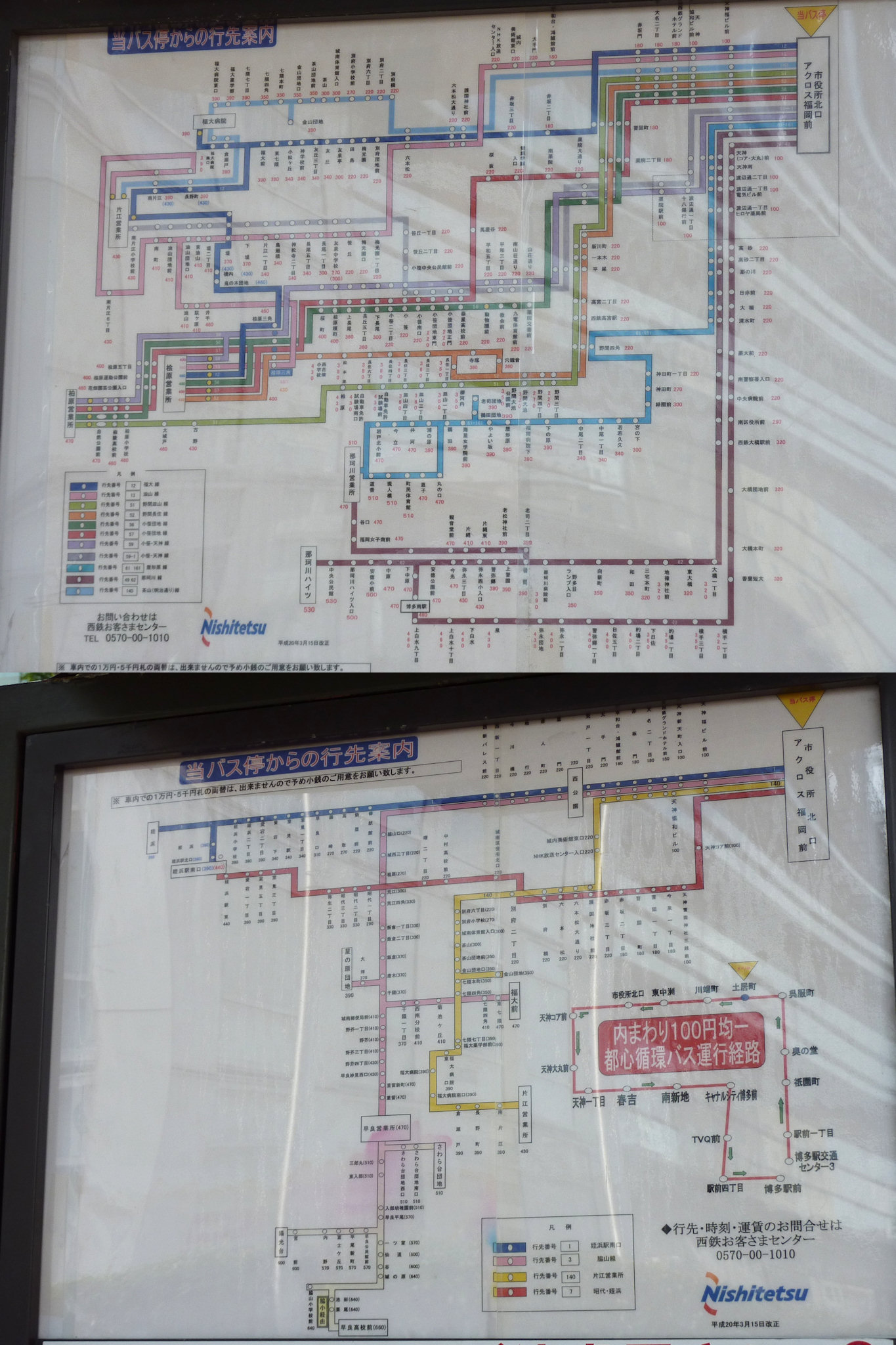 福岡市中央区の「市役所北口・アクロス福岡前」バス停にて。上下どちらの写真もこのバス停を通って西へ行く路線図です。