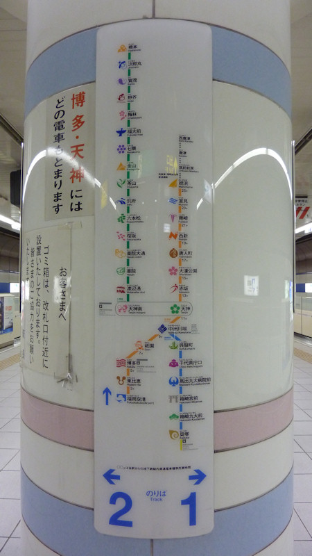 福岡空港駅のホームにて。各駅のシンボルマーク付きでカラフルです。それぞれのマークの意味は福岡市交通局のサイトに載っています。