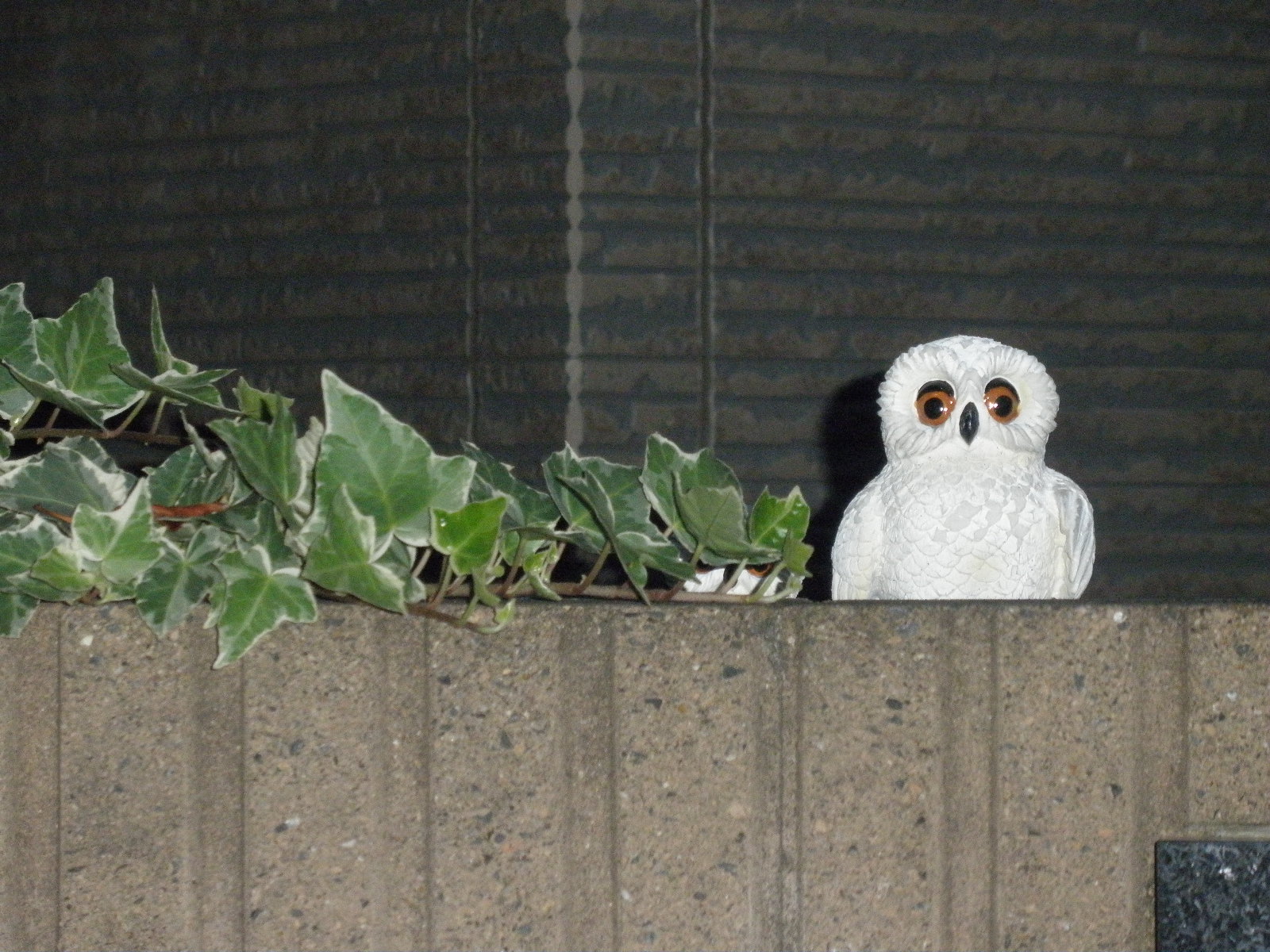 近所の家の門の上にあるフクロウの置物です。フクロウは「不苦労」という当て字から「幸せに暮らせる」ということで縁起がいいと言われているそうです。