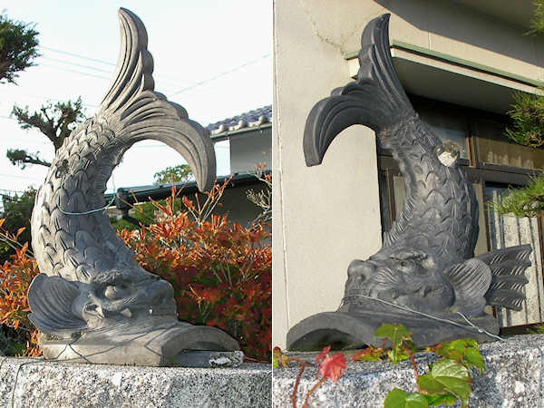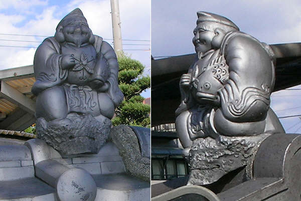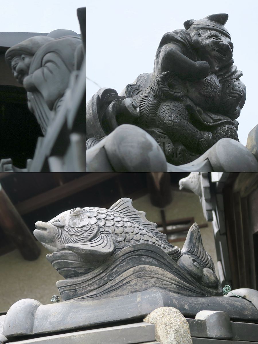 このお宅には恵比須様と大黒様がいました。 塀の上には鯛、鬼瓦は鶴と亀で、かなりの縁起の良さです。