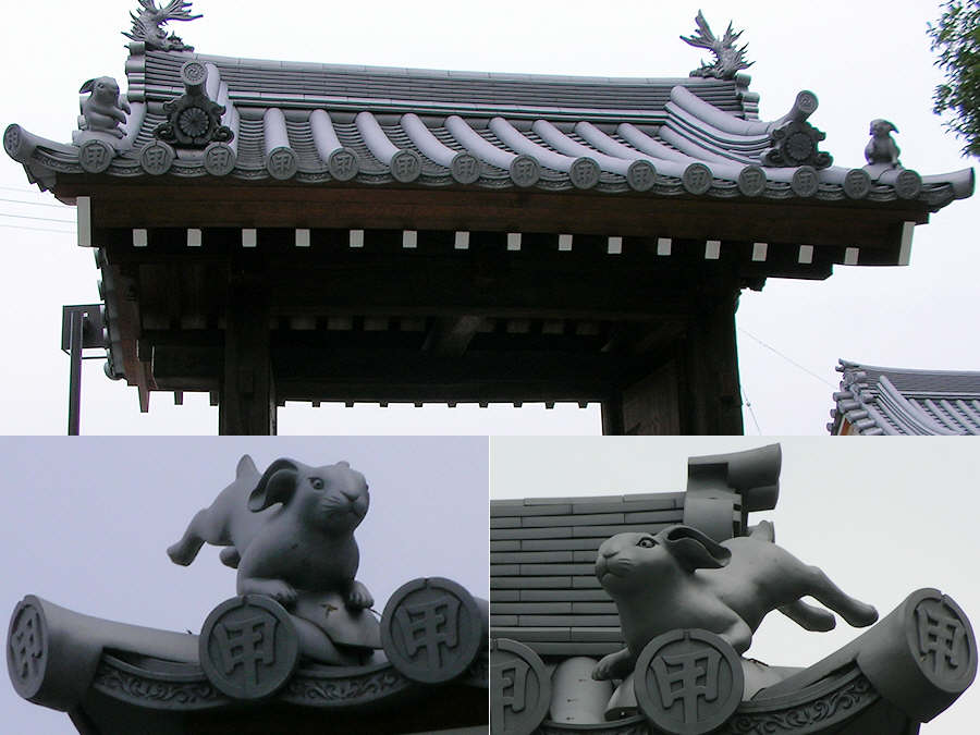 四国霊場八十八箇所の第74番札所。 2つの門の内側(境内側)にウサギが乗っています。 お寺のご本尊が薬師如来で、その脇侍(わきじ・ご本尊の左右に控える菩薩など)の月光菩薩にちなんでいるそうです。 ウサギの鬼瓦も見ることができますよ。