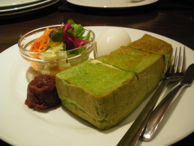 一年前に名古屋に遊びに行ったときに立ち寄ったコーヒー店「時代屋」にて。 抹茶トーストセットです。380円の珈琲のおまけ(!)です。 甘くて美味しかったですよー!