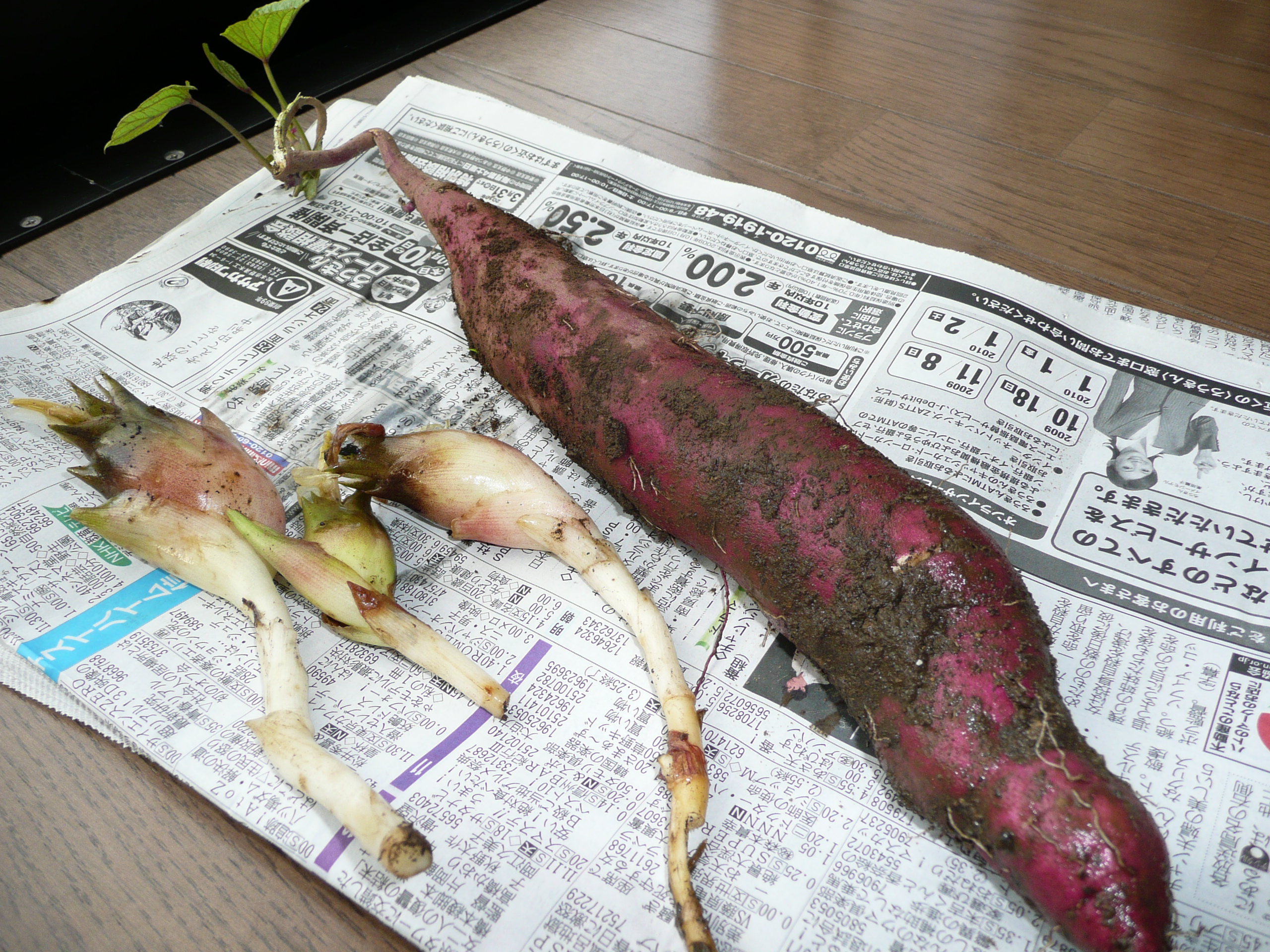 20円だったので葉っぱの三枚ついたさつまいもの苗を一本だけ買ってきて、だめでもともとで植えたら、こんなに立派ないもこが育ってくれていました!嬉しかったので来年はもっと植えたいと思いました! となりは夏からずっと獲れているみょうがです。うまいです!