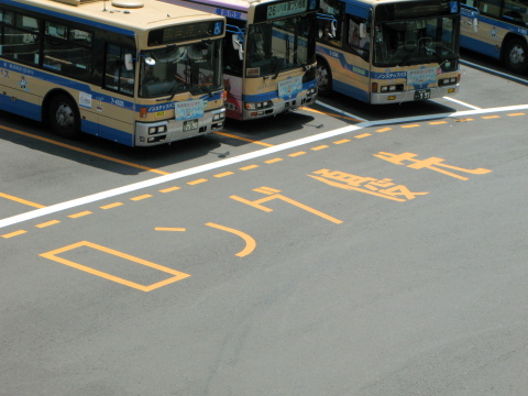 横浜駅東口のバス操車場の地面に「ロンゲ優先」と書いてあるように見えました。もしかして、「ロンゲ=長髪の運転手が運転するバスの優先スペースか?」と思ったら・・・。 「ロンゲ」ではなく「ロング」のようで、「ロングボディ車」の優先スペース(駐車スペースが長い)ということでした。
