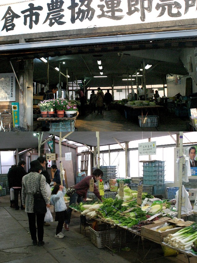 鎌倉駅からほど近い表通りの若宮大路に面した所にある「鎌倉市農協連即売所」。 地元農家が日替わりで色々な地場野菜を即売しています。 結構変わった野菜も置いていて面白いです。 隣には鎌倉中央食品市場というのもあります。 また、道路の反対側にある丸七商店街も戦後の闇市風でなかなか良いです。