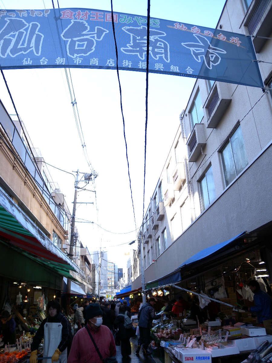 終戦後の青空市からはじまった仙台の朝市です。鮮魚、乾物、野菜などの小さな商店が軒を連ねています。震災の影響で、鮮魚などはいつもより種類も少ないようですが、元気に初売りが行われていました。